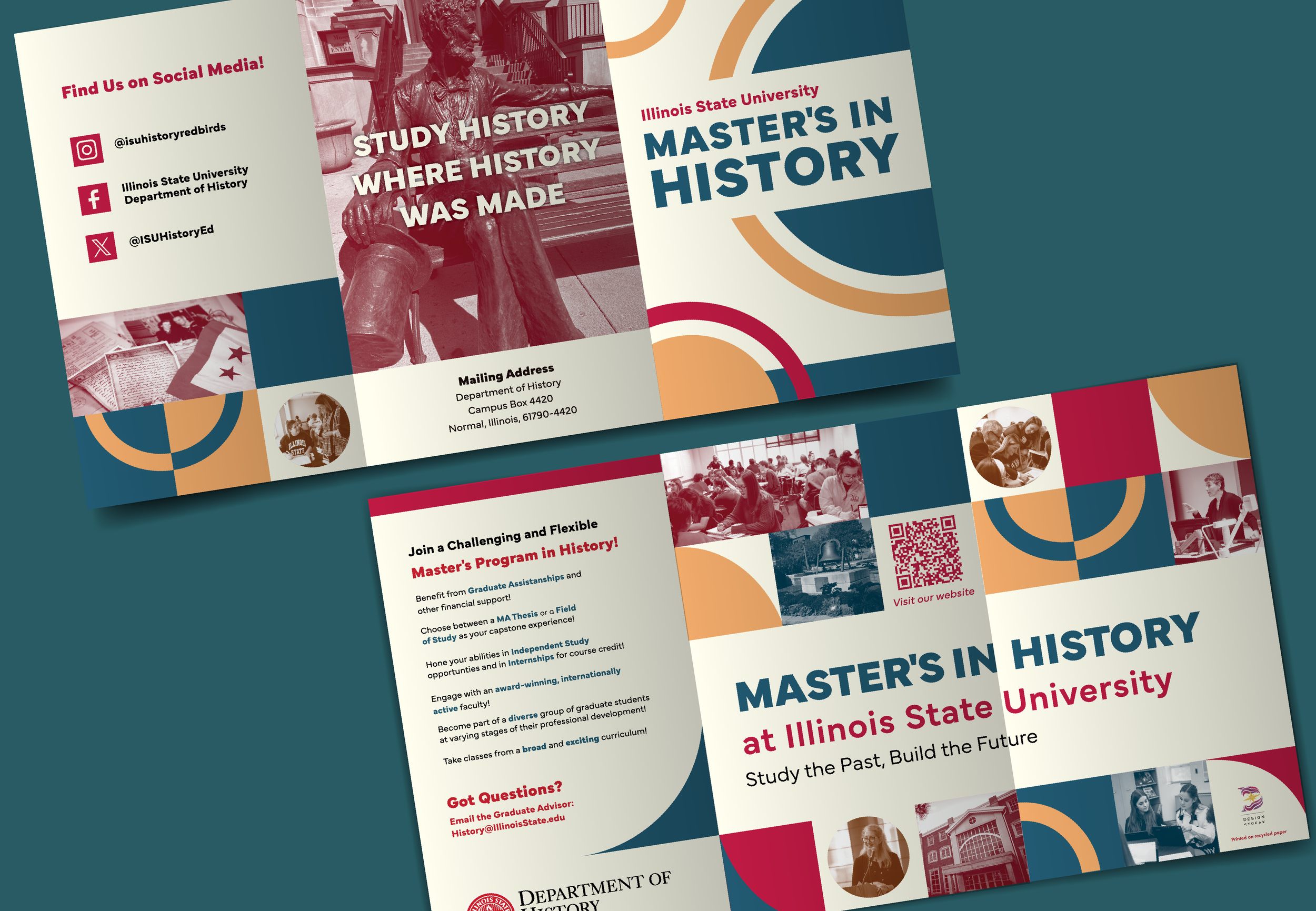 This brochure was created in Design Streak Studio for Illinois State’s History department. As a way to increase registration and interest in their graduate program, the department requested a direct mailer that doubled as a poster to send to prospective students and other universities. Because this poster would most likely be displayed alongside brochures from other schools, the most important factor in its design was uniqueness.